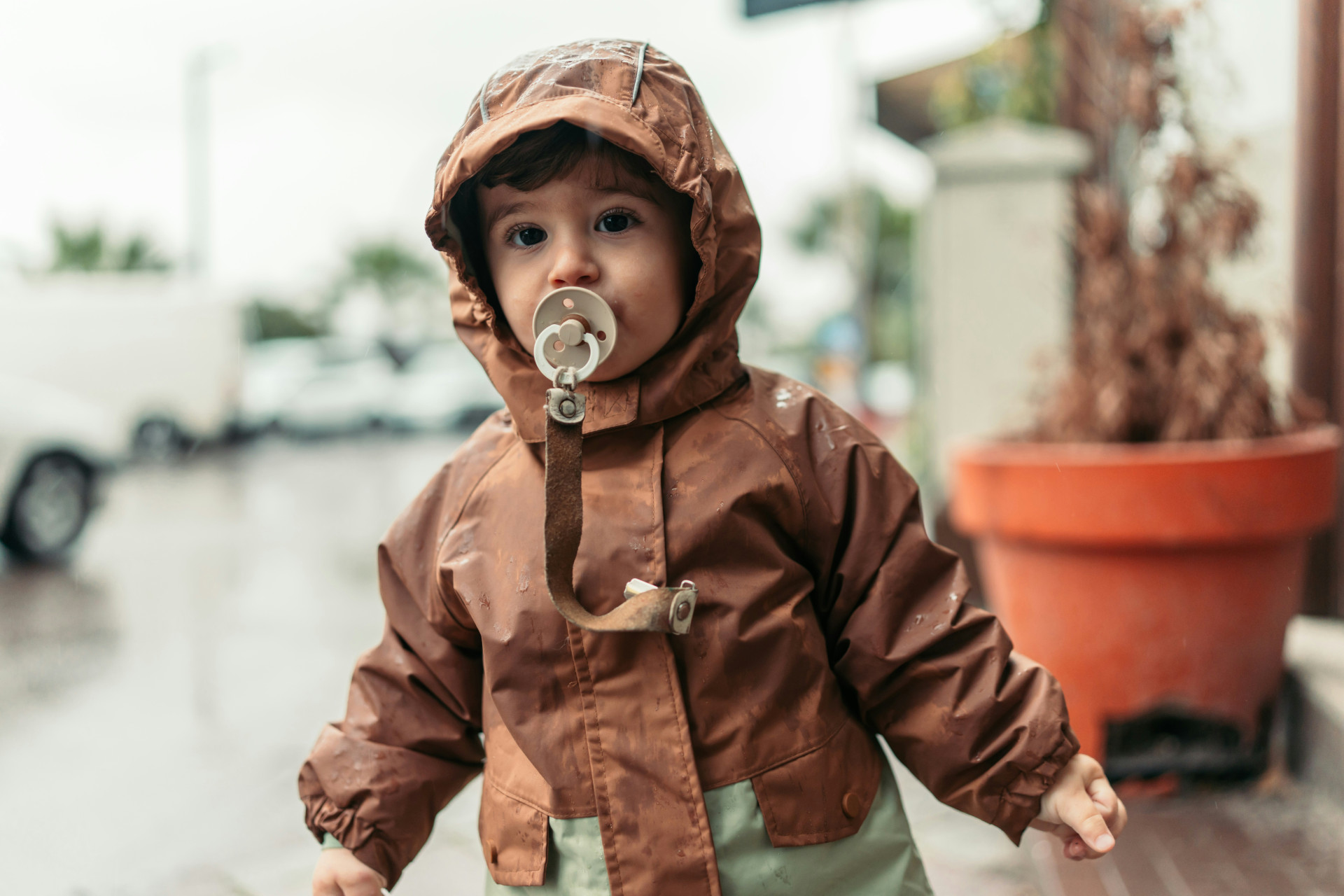 En refleksstribe på højre arm og ben øger synligheden i mørke, og hætten kan tages af efter behov via trykknapper. Den karakteristiske CeLaVi-elefant pryder brystet som et genkendeligt designelement.